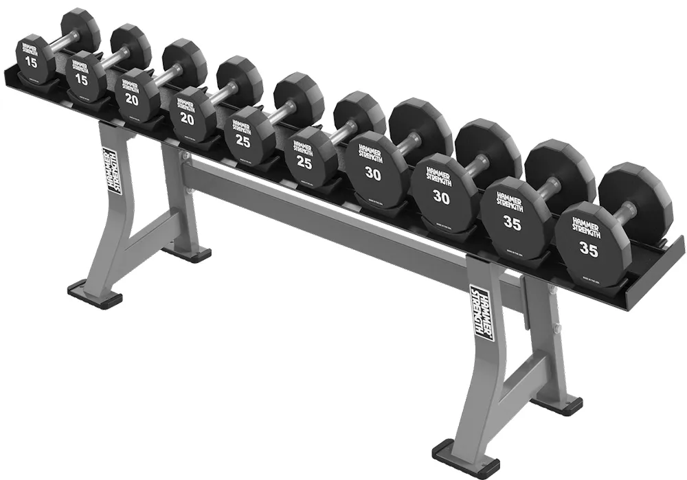 This Hammer Strength dumbbell set includes 15–35 lb rubber-coated hex dumbbells neatly stored on a heavy-duty two-tier steel rack. Designed for home and commercial gyms, it offers durable construction, ergonomic chrome handles, and secure rubber-lined trays. The hex design prevents rolling, while the angled rack ensures easy access, safe storage, and an efficient, organized workout space.
