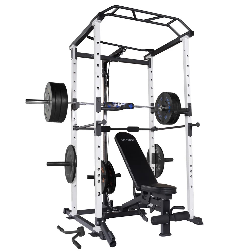 This power rack and Smith machine combo is a complete home gym system designed for full-body strength training. It includes a sturdy rack, Smith bar, adjustable bench, cable pulleys, pull-up station, and weight holders. Users can perform presses, squats, pulldowns, rows, and leg exercises in one compact setup. It’s ideal for safe, versatile, and progressive home workouts.